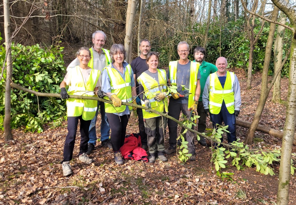 Nine enthusiastic volunteers spent five hours in the spring sunshine recently cutting back rhododendrons and laurel from around the old Boating Lake in Swarland Wood.