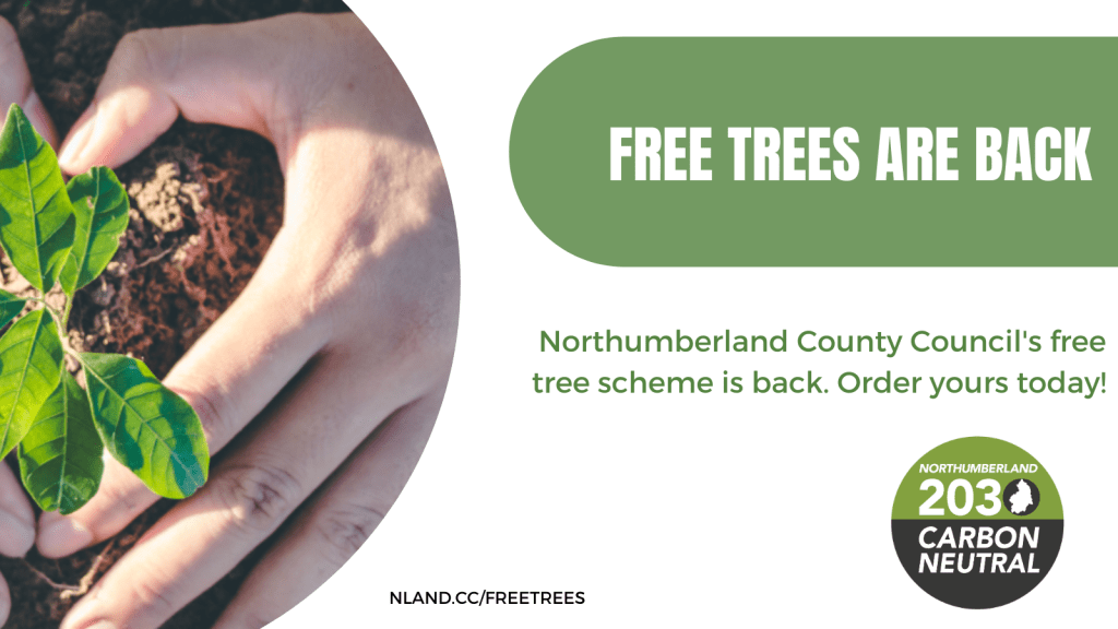 Northumberland County Council are repeating their free tree giveaway this year. Local residents, schools and community groups can get a free tree or tree pack to plant to help tackle climate change. Species are available for small, medium and large sized gardens, as well as smaller shrubs for those with more limited space. For more information visit Free Tree Giveaway