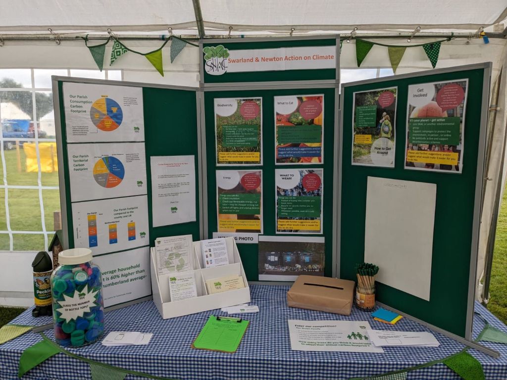 SNAC’s stall at the Swarland Show was a great success – with lots of information about ways to be ‘greener’. With information about the size of the parish’s carbon footprint – which is 60% higher than the average for Northumberland – it was great to be able to offer suggestions for how to be more sustainable – and hear about what would help people to do that more easily.