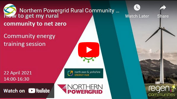 How to Get My Community to Net Zero. Produced by Regen Communities in collaboration with Northern Powergrid, this online training workshop is for anyone interested in helping their rural community get to net zero who wants to know more about practical local energy projects to achieve this. With Northern Powergrid, Regen and the Regional Energy Hubs, this video explored projects viable in rural areas now, from energy efficiency advice to network innovation. Included are case studies from leading groups, and lessons from successful and more challenging Rural Community Energy Funded projects. Click to view on YouTube
